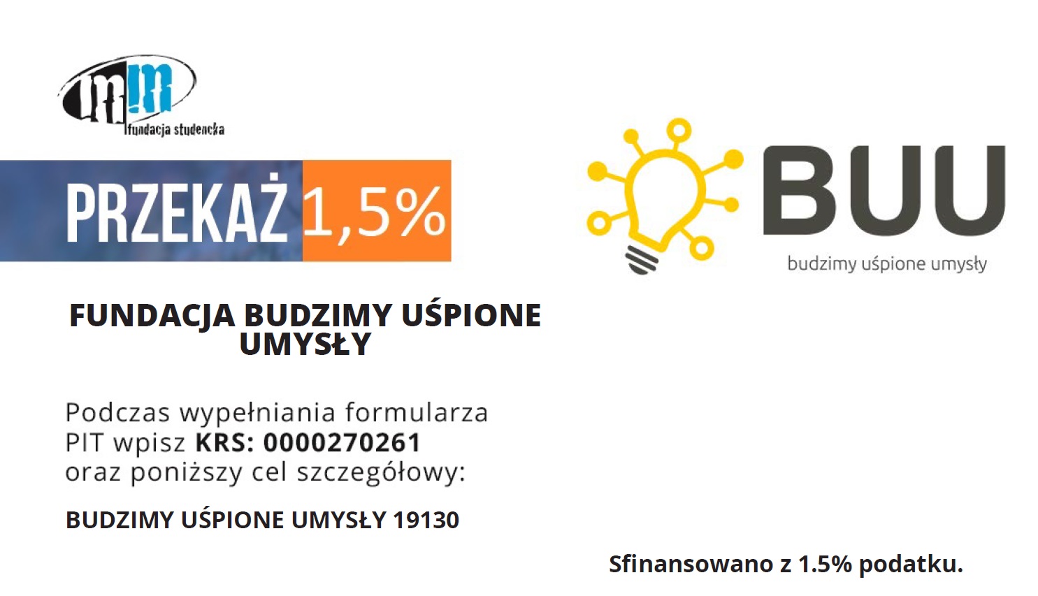 Od 2024 roku możesz wspomóc działalność Fundacji Budzimy Uśpione Umysły przekazując 1,5% swojego podatku.